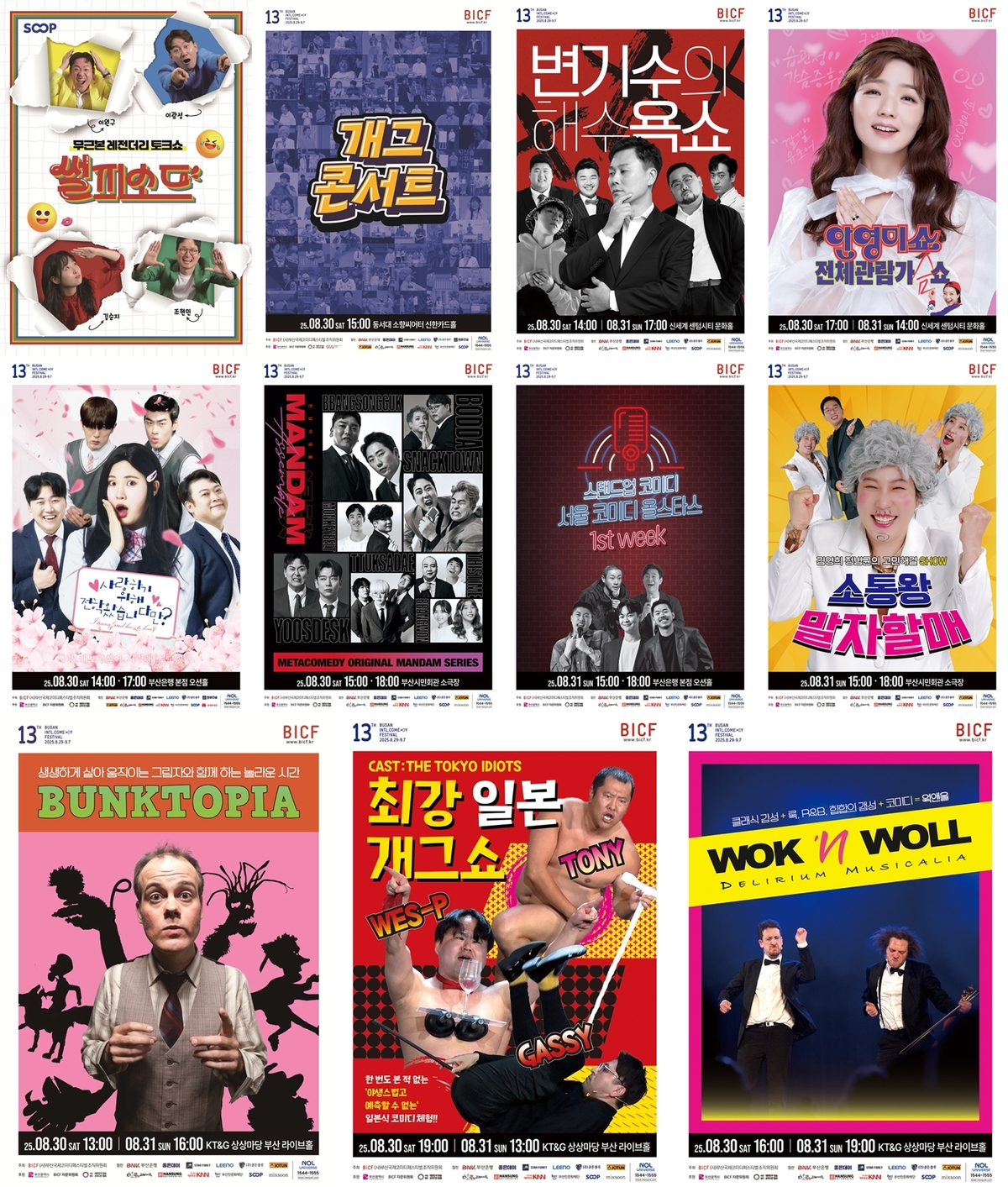 개막까지 사흘 앞둔 ‘제13회 부산국제코미디페스티벌’(이하 ‘부코페’)은 오는 8월 29일(금)부터 9월 7일(일)까지 열흘간 부산 전역에서 개최된다. 화려한 극장 라인업을 완성한 ‘부코페’는 아시아 최대 코미디 페스티벌의 명성에 걸맞은 수준 높은 공연을 관객들에게 선보이며, 축제의 질을 높인다. 대한민국 개그계를 이끌어온 스타 개그맨들과 신선한 크리에이터, 그리고 세계 각국의 유쾌한 코미디 아티스트들이 총출동해 한층 다채롭고 풍성한 무대로 관객들을 맞이할 예정이다.