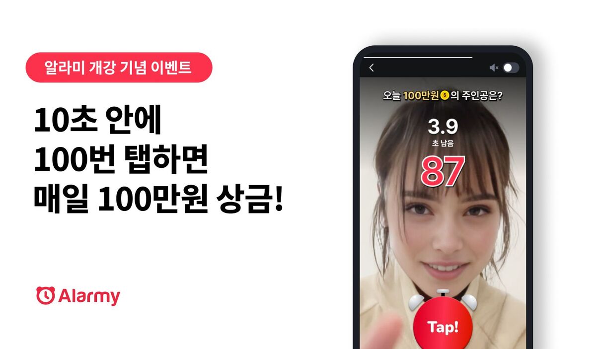 알라미 앱에서 기상 미션으로 100탭 챌린지를 선택하면 누구나 참여 가능하다. 알람을 설정하고, 해제를 위해 10초 안에 화면 속 버튼을 100회 탭하면 성공하는 방식이다. 미션을 달성한 사용자 중 추첨을 통해 매일 한 명에게 상금 100만원(VAT 별도)을 지급한다. 당첨자 명단은 알라미 공지사항 란에서 확인할 수 있으며, 챌린지 기간은 9일까지다.