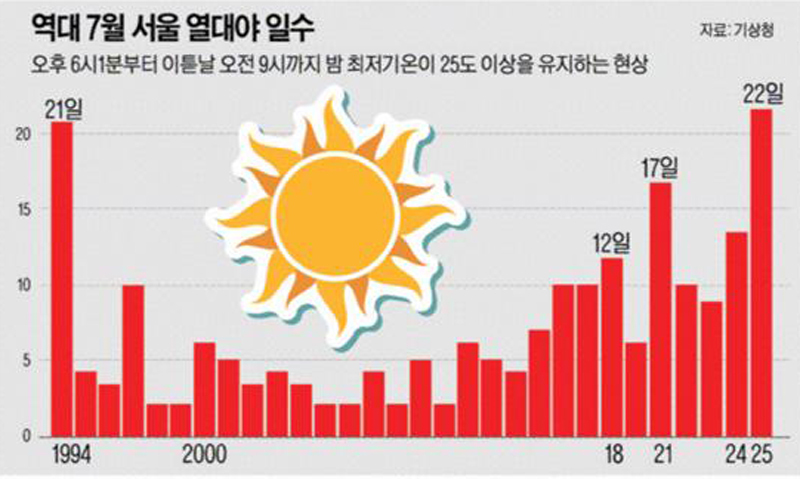 올해 여름은 유독 심하다. 7월 전국 평균 기온은 27.1도로 1973년 관측 이래 두 번째로 높은 수치였다. 서울은 22일 연속 열대야를 기록했다. 올 여름 밤 최저기온은 29도를 웃돌며 1908년 기상 관측 이래 최장 기간 무더위가 이어졌다. 집중호우 피해도 만만치 않다. 경기 가평·충남 산청 등지에는 최대 800㎜ 폭우가 쏟아지며 19명이 숨지고 1만3000명이 넘는 이재민이 발생했다.