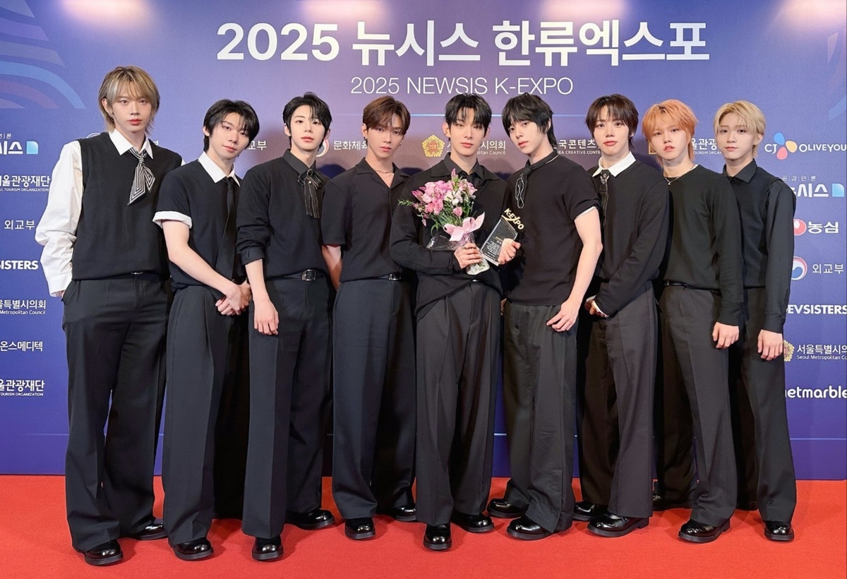 아홉(AHOF)은 지난 28일 서울 소공동 롯데호텔 크리스탈 볼룸홀에서 열린 '제7회 뉴시스 한류엑스포(2025 K-엑스포)'에 참석해 글로벌 네티즌상-넥스트 아이콘 부문을 수상했다.