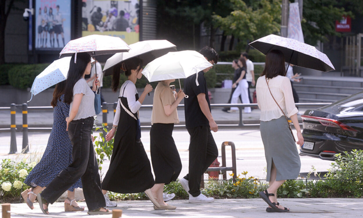 서울 낮 최고 기온 30도를 예보한 8일 오후 서울 종로구 새문안로에서 시민들이 양산을 쓰고 이동을 하고 있다.