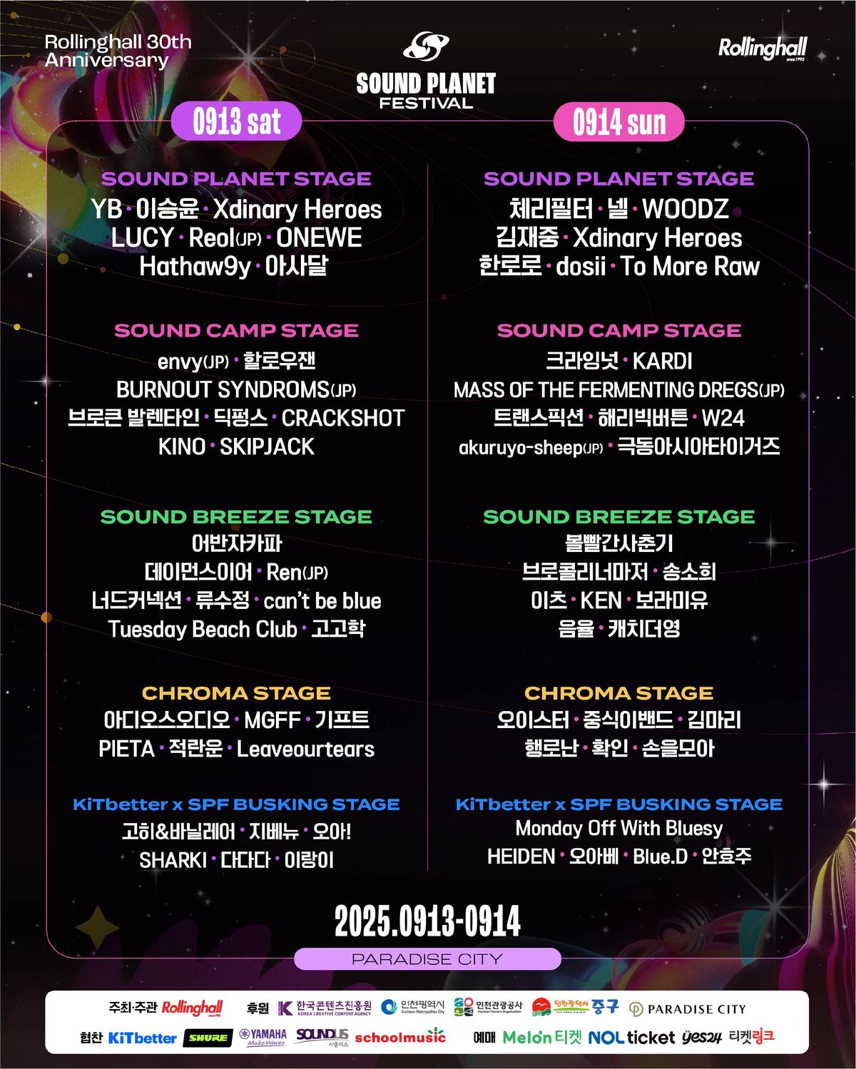 이번 ‘사운드플래닛페스티벌 2025’는 홍대 인디 음악의 상징인 롤링홀의 30주년을 기념해 개최되는 페스티벌로 다양한 아티스트들과 함께 하며 그 의미를 더하고 있다. YB부터 우즈, 체리필터, 엑스디너리 히어로즈, 크라잉넛, 넬, 김재중, 어반자카파, 볼빨간사춘기, 이승윤, 한로로, envy(JP), Reol(JP), 트랜스픽션, 마스도레(JP), 송소희, 브로콜리너마저, 류수정, 딕펑스, 할로우잰 등 세대를 아우르는 70여팀의 라인업이 총망라됐다.