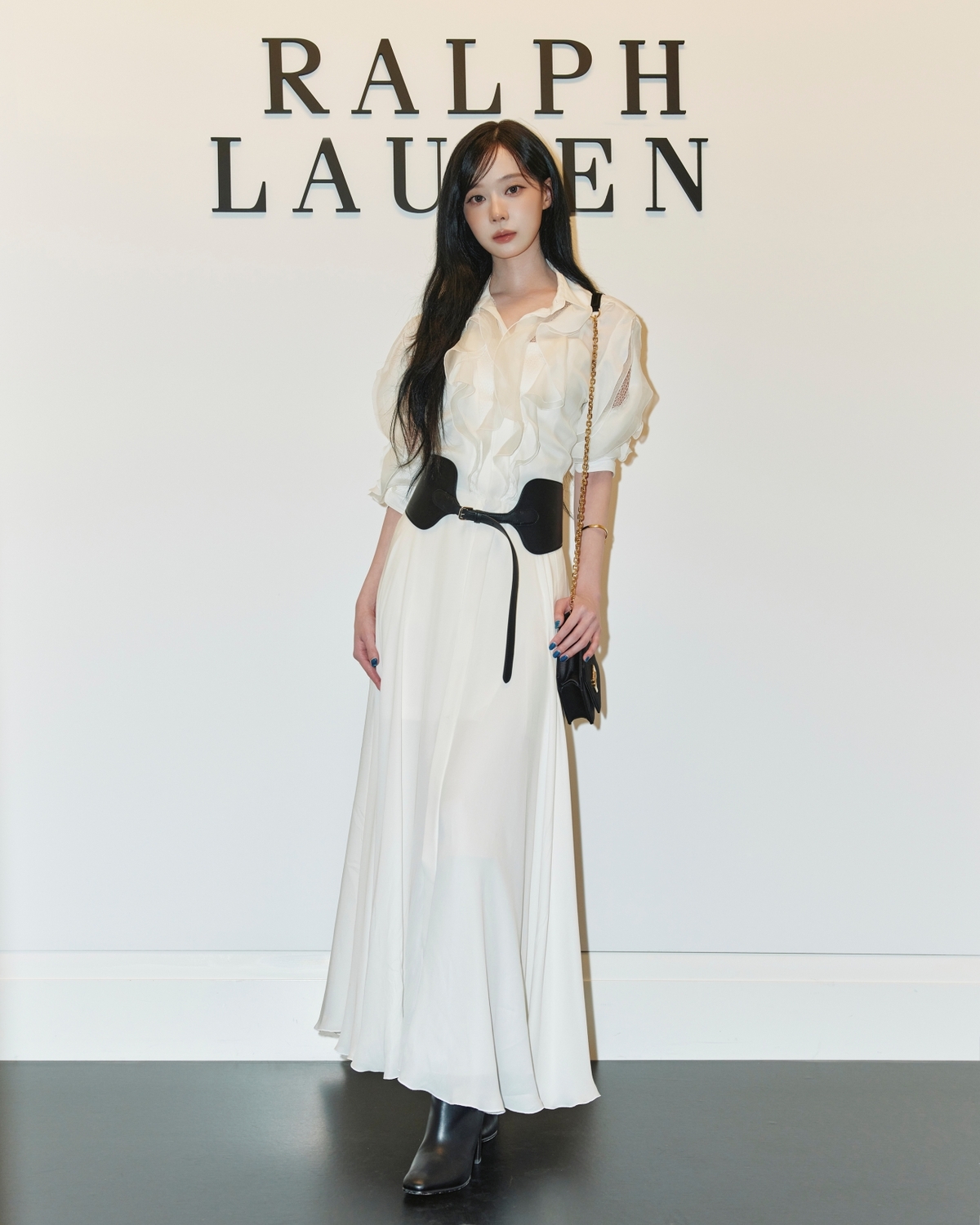 윈터는 랄프 로렌 2025 가을 시즌의 실크 드레스에 코르셋 벨트를 더해 클래식한 분위기를 연출했다. 여기에 새틴 소재의 크로스바디 체인을 매치해 고급스러우면서도 세련된 매력을 강조했다.