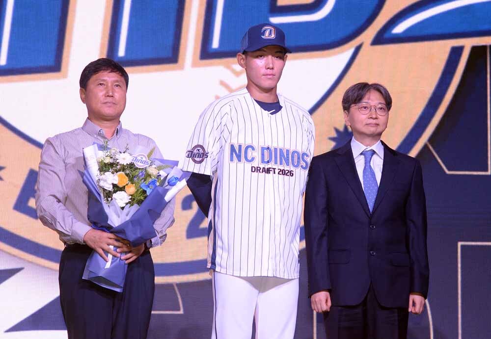 프로야구 NC에 지명된 신재인(가운데)이 17일 서울 송파구 롯데호텔 월드 크리스탈볼룸에서 열린 2026 KBO 리그 신인드래프트에서 임선남 단장(오른쪽)과 아버지와 함께 기념촬영을 하고 있다. 사진=김두홍 기자 kimdh@sportsworldi.com