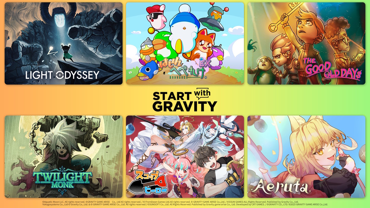 그라비티 게임 어라이즈는 이번 행사에서 PC 및 콘솔 타이틀 5종과 모바일 게임 1종, 총 6종을 출품한다. 베이커리 경영 액션 역할수행게임(RPG) ‘아루타(Aeruta)’, 탐색형 2.5D 액션 RPG ‘트와일라잇 몬크(Twilight Monk)’, 소울라이크 보스 러시 ‘라이트 오디세이(Light Odyssey)’, 메트로배니아 어드벤처 ‘더 굿 올드 데이즈: 누기스의 대모험(THE GOOD OLD DAYS: 누기스의 대모험)’, 레이스 액션 게임 ‘하시레 헤베레케:EX(Hashire HEBEREKE:EX)’와 그라비티 본사에서 개발한 땅파기 퍼즐 RPG ‘스코프 히어로(SCHOP HERO)’다.
