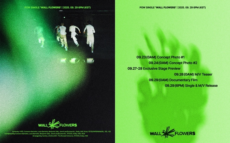 신곡 ‘Wall Flowers’는 평범해 보이지만 자신만의 존재감을 조용히 발산하는 이들의 이야기를 담았다. 마치 벽에서 피어난 꽃처럼 척박한 환경 속에서도 묵묵히 제 길을 걸어가는 파우(POW)의 모습을 투영했으며, 세상에 작지만 선명한 흔적을 남기는 존재들에 대한 찬사를 노래한다.