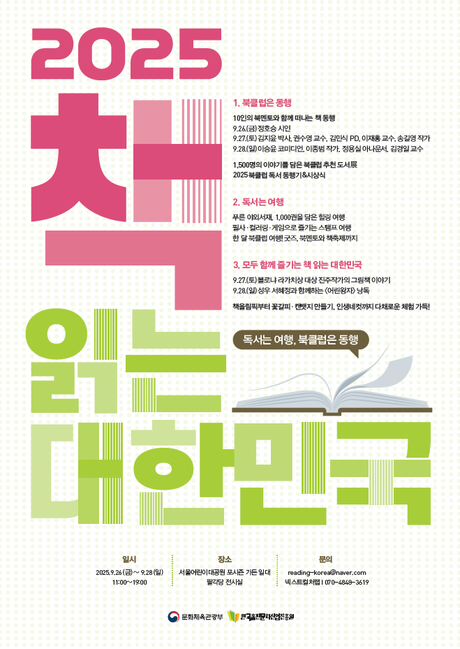 문화체육관광부는 한국출판문화산업진흥원과 함께 오는 26∼28일 서울 광진구 서울어린이대공원 포시즌 가든과 팔각당 전시실에서 독서는 여행, 북클럽은 동행을 주제로 2025 책 읽는 대한민국을 처음 개최한다고 25일 밝혔다.