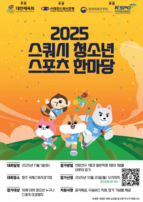 대한스쿼시연맹이 다음 달 1일 충청북도 청주에 위치한 청주국제스쿼시경기장에서 ‘2025 스쿼시 청소년스포츠한마당’을 주관해 개최한다. 일반 학생 1명과 학생 선수 1명이 한 팀을 이뤄 참가하는 색다른 스쿼시가 펼쳐진다.