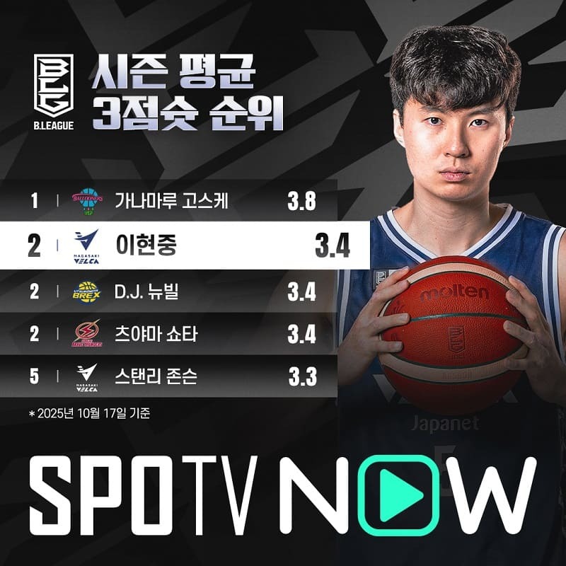 이현중의 활약과 함께 소속팀 나가사키 역시 좋은 성적을 내고 있다. 앞서 개막전서 패배했지만, 이후 4연승을 내달리며 서부지구 1위에 올랐다. 올 시즌 리그 평균 득점 1위(92.8점)의 비결은 단연 3점슛이다.