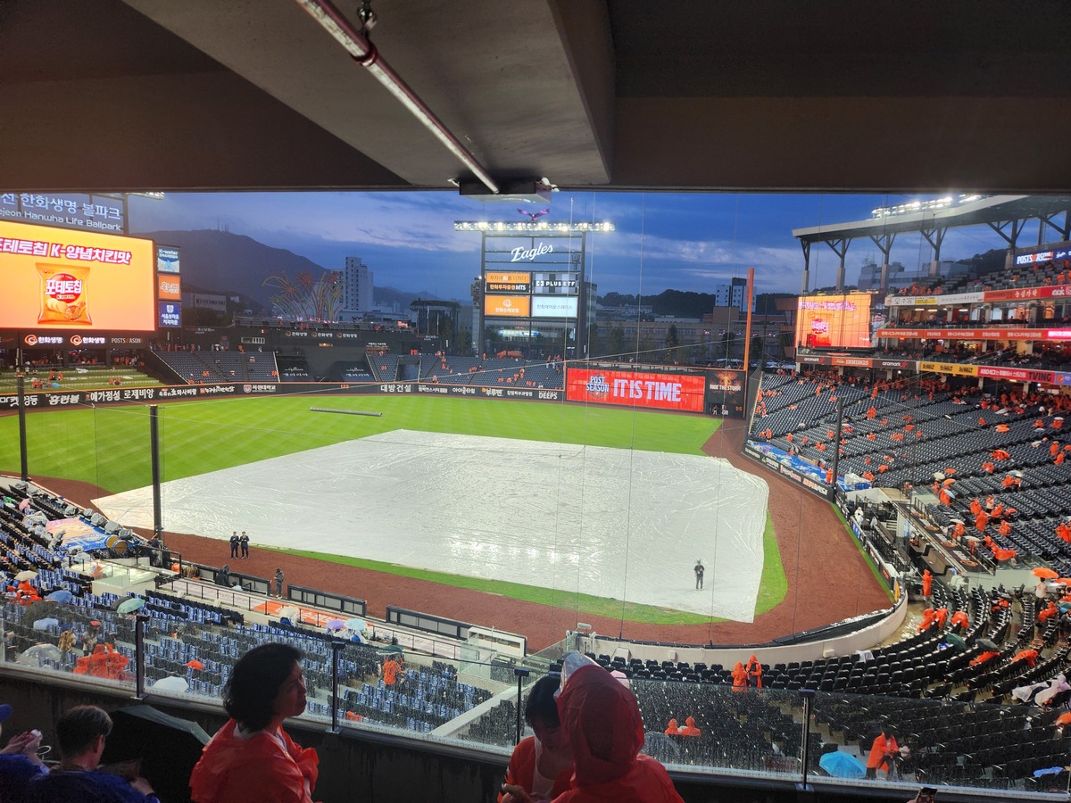 당초 예보보다 앞당겨져 쏟아졌다. 기상청에 따르면 이날 오후 9시부터 비 소식이 있었다. 그러나 홈팀 한화의 훈련 시간이었던 오후 4시부터 비가 흩뿌리기 시작했다. 한 시간 뒤부턴 빗줄기가 굳어졌고, 결국 경기장 내 대형 방수포가 깔렸다.