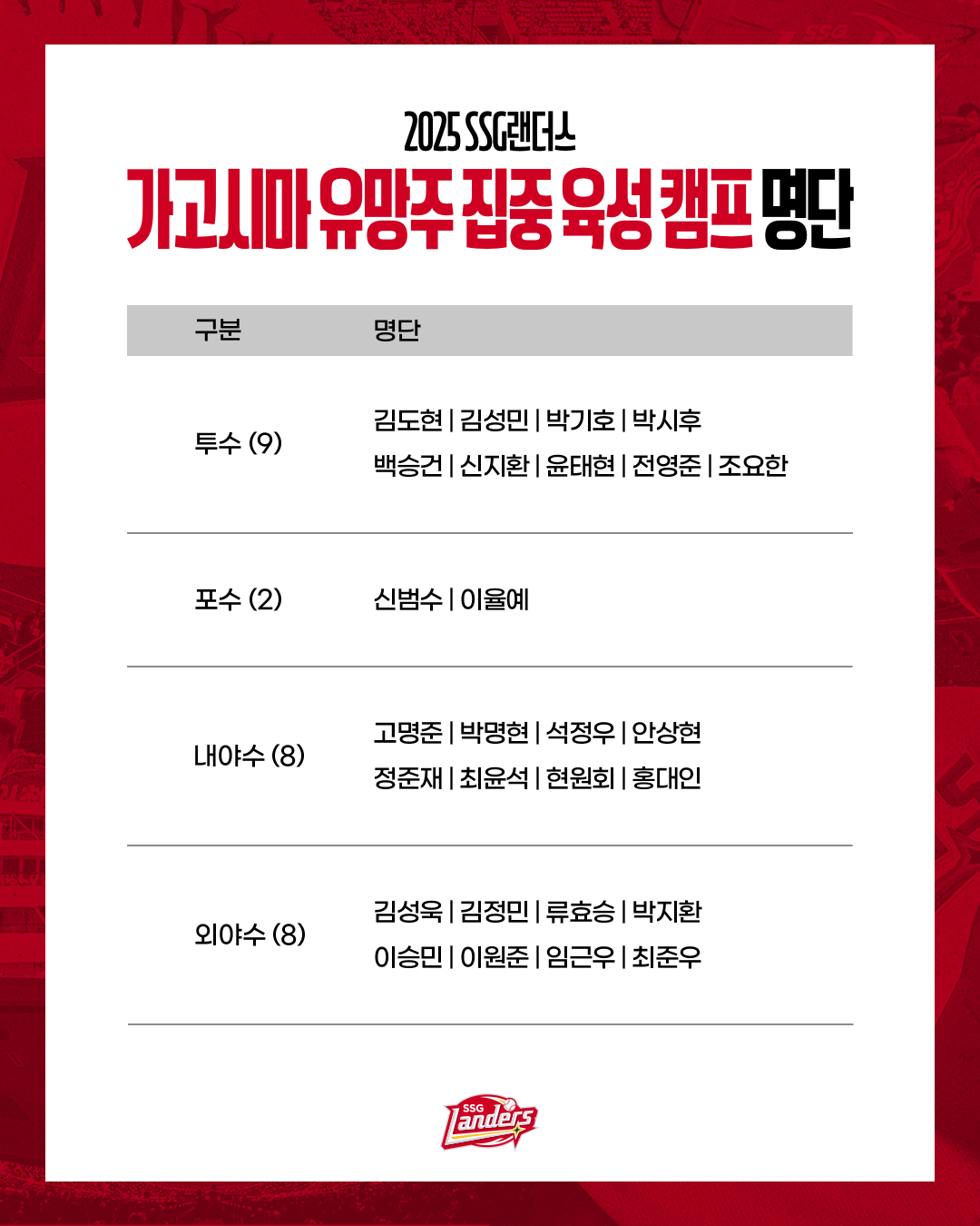 이번 캠프는 기존의 ‘마무리 훈련’을 넘어, 미래 주축 선수들의 성장과 팀 전력 강화를 위한 전략적 육성 캠프로 기획됐다. SSG는 선수들의 성장 및 상황에 맞춰 체계적 훈련을 진행할 계획이다.