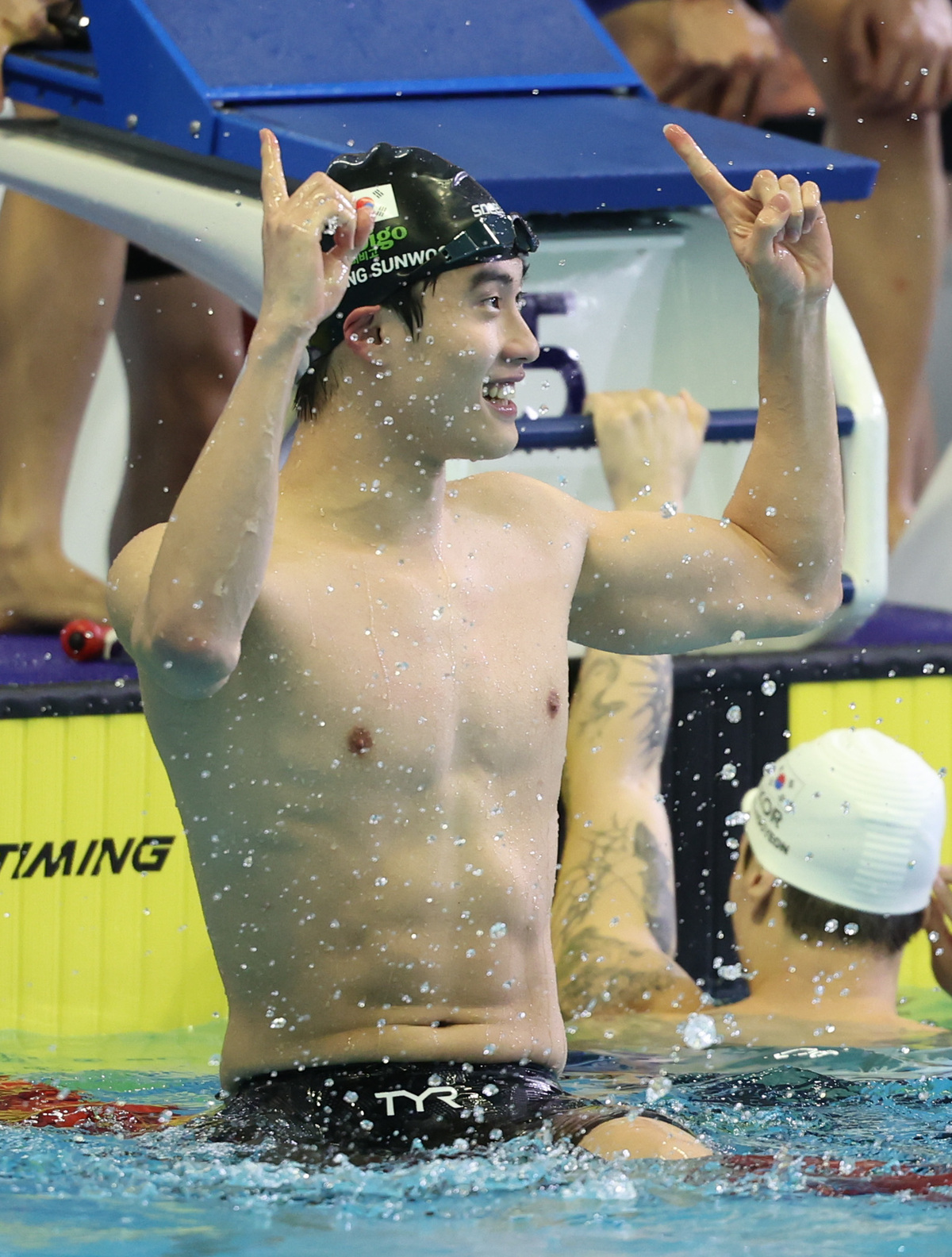 기쁨의 눈물을 흘렸다. 황선우는 지난 20일 남자 일반부 자유형 200m 결선에서 1분43초92로 1위를 차지했다. 기록을 확인한 뒤 눈물을 왈칵 쏟았다. 그토록 염원하던 아시아신기록을 세웠기 때문. 2023년 항저우 아시안게임(AG)서 자신이 세운 한국 기록(1분44초40)을 넘어선 것은 물론, 쑨양(중국)이 보유하던 아시아 기록(1분44초39)까지 격파했다. 더불어 한국 신기록을 세운 개인혼영 200m, 계영 800m와 계영 400m까지 우승하며 4관왕에 올랐다.