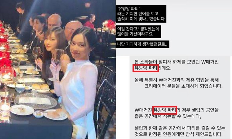 23일 패션 유튜버 시누(본명 전신우)가 W코리아 초대장에서 ‘유방암 파티’라는 표현이 사용된 사실을 공개하며 또 한 번 논란이 됐다. 시누는 “‘유방암 파티’라는 기괴한 단어를 보고 솔직히 ‘이게 맞나’ 했다. ‘이걸 간다고?’ 생각했는데 많이들 가셨더라. 나만 기괴하게 생각했던 걸로”라며 황당함을 전했다.
