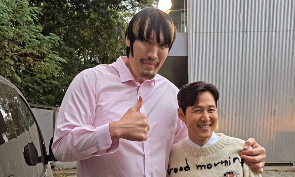 공개된 사진 속 최홍만은 분홍색 셔츠를 입고 이정재의 어깨를 감싸며 엄지를 치켜든 포즈를 취하고 있다. 180cm 장신인 이정재조차 작아 보이게 만드는 217cm 최홍만의 압도적인 피지컬이 눈길을 끈다. 두 사람은 다정한 미소로 카메라를 응시하며 훈훈한 분위기를 자아냈다.