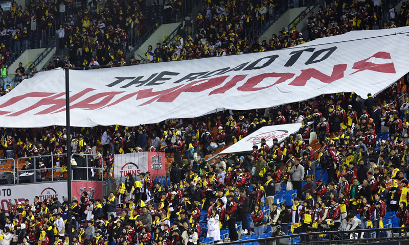 올해 한국 프로스포츠 최초 1200만 관중 돌파(최종 1231만2519명)로 뜨거웠던 야구 열기는 KS에서도 변함없이 타오른다. SSG와 삼성이 치른 지난 준플레이오프(준PO) 4차전을 기점으로 PS 27경기 연속 매진을 찍어 종전 최고 기록이던 26경기 연속(2009년 10월10일 SK(현 SSG)-두산 PO 3차전∼2011년 10월9일 KIA-SK 준PO 2차전)을 넘어선 완판 행렬이 이날 34경기로 불어났다. KS로만 한정한다면 2022년에 키움과 SSG가 맞닥뜨린 KS 1차전부터 18경기 연속 매진이다.
