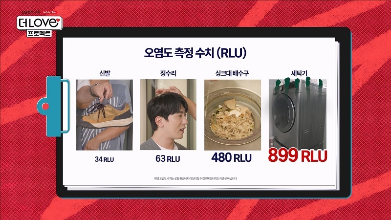 1화 ‘더LOVE게 심각한 나의 세탁기’ 편에 출연한 6인 가족은 하루 사용 수건만 20장이 넘는 등 잦은 빨래로 인해 빨래 후에도 세탁물에서 쉰내가 난다는 고민으로 방문 케어를 신청했다. 3년 간 사용한 이 가족의 세탁기 내부 오염도는 899RLU로 측정됐다(실시간 세균오염도 측정기 ‘클린큐’ 사용). 비교군으로 현장에서 함께 측정한 김원훈 대리의 정수리 오염도는 63RLU, 촬영감독의 신발 오염도는 34RLU, 음식물이 꽉 찬 싱크대 배수구 오염도는 480RLU였다.