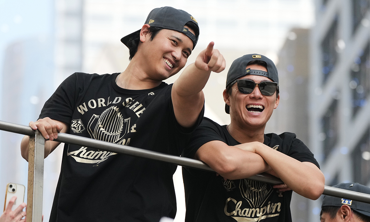 WS 3경기에 등판해 2차전 완투승(9이닝 1실점) 포함 3승 평균자책점 1.02(17⅔이닝 2자책점)을 써내며 시리즈 최우수선수(MVP)로 빛난 야마모토 요시노부도 무대에 올랐다. 야마모토는 팬들을 향해 영어로 “패배는 우리의 선택지가 아니었다”는 짜릿한 한마디를 건네며 다저스타디움을 들끓게 만들었다.