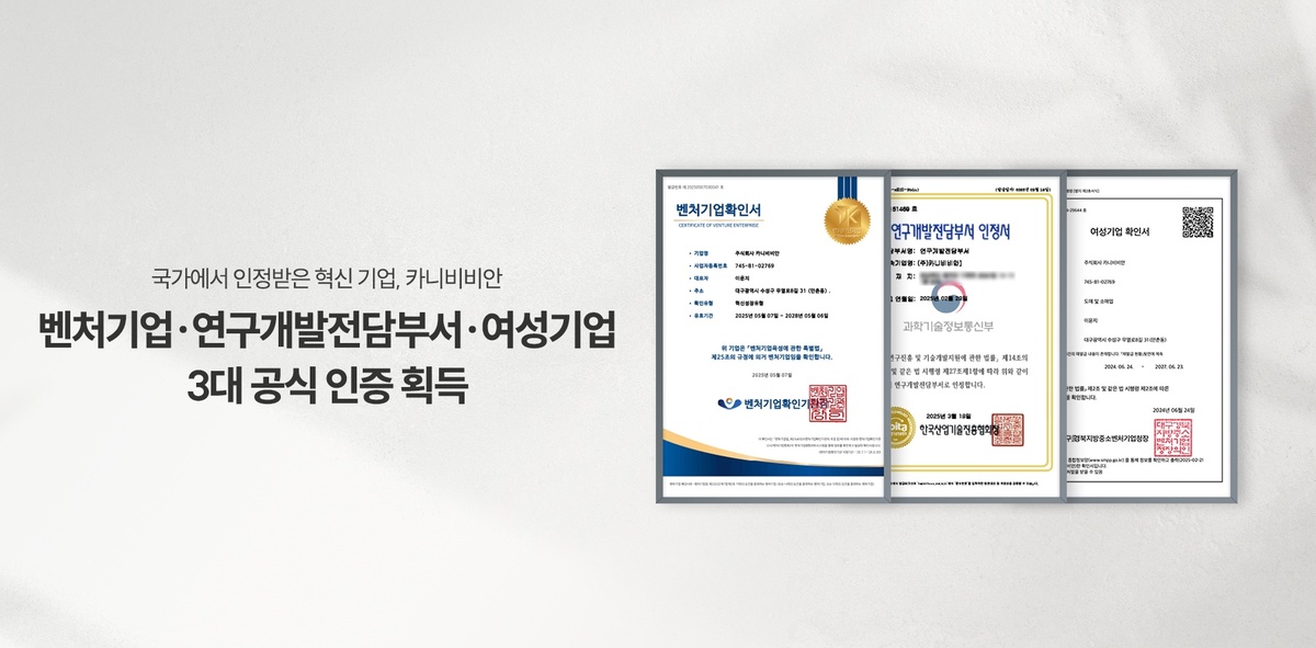 카니비비안 측은 지난 5월 7일 벤처기업 인증을 취득하며 혁신성과 성장 역량을 인정받았다. 연구개발전담부서를 공식 설립해 개발 체계를 고도화하고, 여성기업 인증을 확보하며 기업 운영의 독립성과 신뢰성을 갖춘 구조를 마련했다.