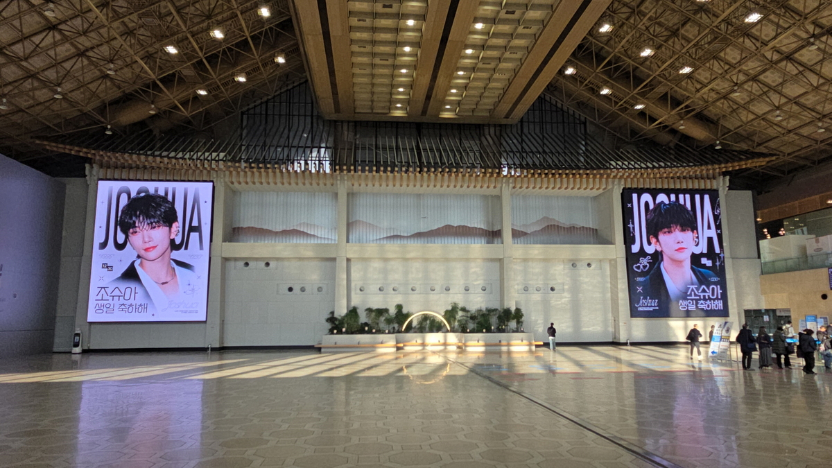 그룹 세븐틴 조슈아의 중국 팬연합 CHINA JOSHUA BAR가 오늘부터 일주일간 김포공항 국제선 3층 출발장 일반 대합실에 설치된 2기의 대형 LED 전광판 ‘랜드마크 PKG’를 통해 조슈아의 30번째 생일을 기념하는 생일 축하 광고가 송출된다고 9일 밝혔다.