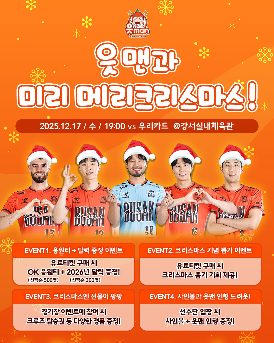 남자프로배구 OK저축은행은 “17일 부산 강서실내체육관에서 열리는 진에어 2025-2026 V리그 3라운드 우리카드와 홈경기에서 크리스마스 분위기를 담은 다양한 팬 참여 이벤트를 진행한다”고 16일 밝혔다.