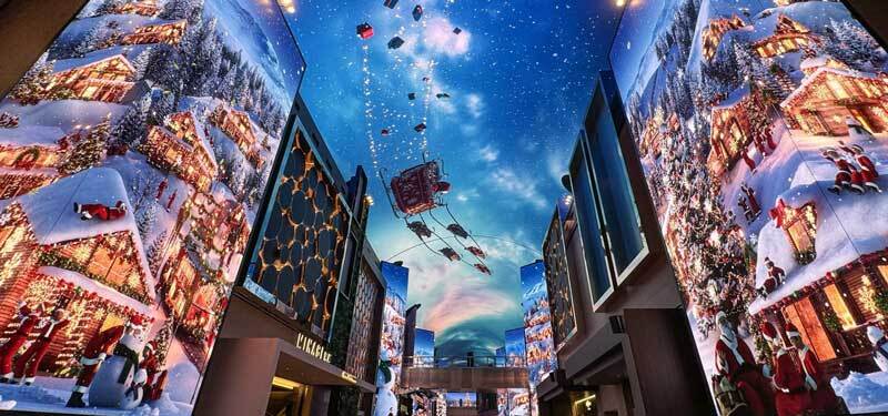 로툰다를 지나면 150m 길이의 오로라가 이어진다. 천장과 벽면 전체를 덮은 초대형 LED 스크린은 겨울 시즌을 맞아 산타 빌리지와 ‘오로라 익스프레스’로 갈아입었다. 산타의 썰매가 황금빛 궤적을 그리며 머리 위를 가로지르고, 빛으로 구현된 열차가 힘차게 질주한다.