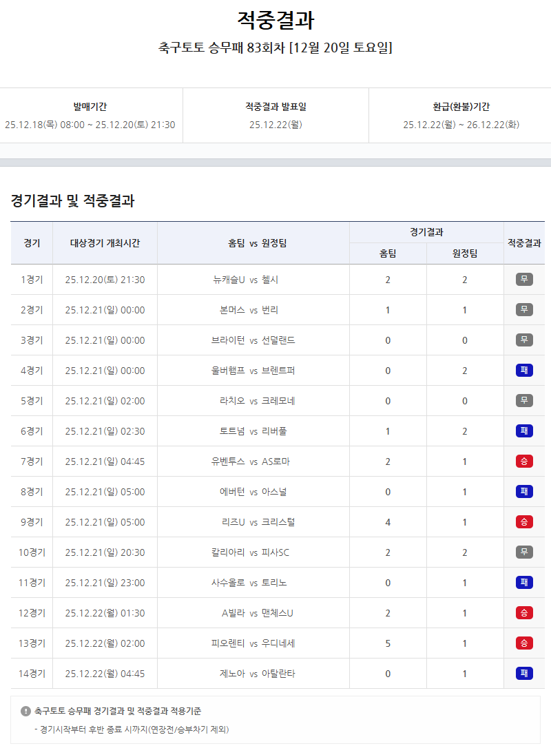 서울올림픽기념국민체육진흥공단이 발행하는 체육진흥투표권 스포츠토토의 수탁사업자 한국스포츠레저㈜가 공식 인터넷 발매 사이트 ‘베트맨’을 통해 지난 12월 20일부터 22일까지 진행된 영국 프리미어리그(EPL) 및 이탈리아 프로축구(세리에A) 14경기를 대상으로 실시한 축구토토 승무패 83회차의 적중결과를 발표했다.