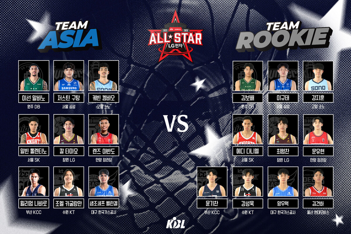 팀 루키에는 에디 다니엘(SK)과 강성욱(KT), 양우혁(한국가스공사), 김건하(현대모비스) 등 총 8명의 올 시즌 신인선수를 포함해 총 10명의 선수가 선발됐다.