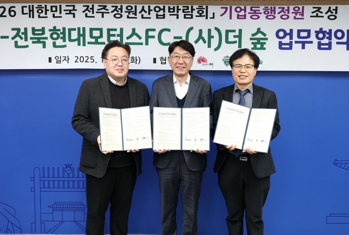 전북현대는 지난 23일 전주시청에서 전주시(시장 우범기), 사단법인 더숲(대표 정명운)과 함께 ‘2026 대한민국 전주정원산업박람회’ 기업동행정원 조성을 위한 업무협약을 체결했다.