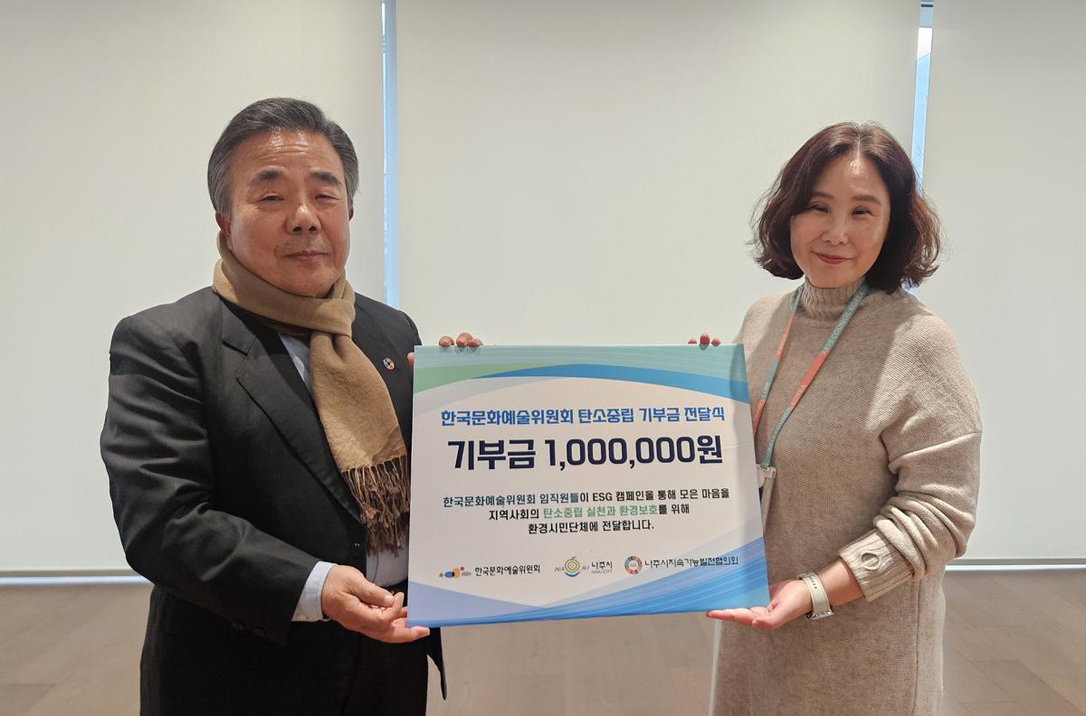 아르코는 지난 17일 전남 나주에 위치한 한국문화예술위원회 본관 1층 아르코홀에서 나주시 및 나주시지속가능발전협의회와 협력 방안을 논의하는 간담회와 기부식을 열었다. 나주시 환경관리과, 나주시지속가능발전협의회, 아르코 관계자 등 총 8명이 참석했다. 기부금은 직원 참여형 중고물품 나눔 캠페인을 통해 조성된 수익금으로 지역사회에 환원하고자 마련됐다.