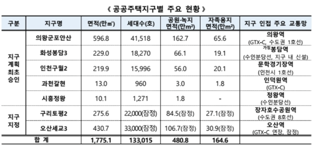 해당 공공주택지구들은 수도권 주요 지역으로 교통 연결성이 높다. 여의도공원의 21배에 달하는 총 480만㎡ 규모의 공원∙녹지와 총 164만㎡의 자족 용지도 조성한다.