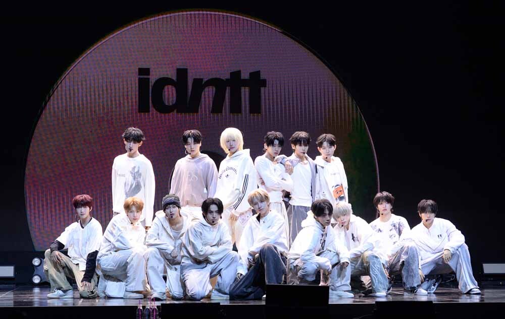 그룹 아이덴티티(김도훈, 김희주, 최태인, 이재영, 김주호, 남지운, 이환희, 이청명, 토와, 이규혁, 박누리, 김성준, 한예준, 최경빈, 황은수)가 5일 서울 용산구 블루스퀘어에서 진행된 'yesweare' 발매기념 쇼케이스에서 열창하고 있다.