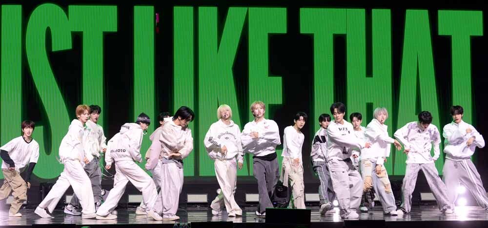 그룹 아이덴티티(김도훈, 김희주, 최태인, 이재영, 김주호, 남지운, 이환희, 이청명, 토와, 이규혁, 박누리, 김성준, 한예준, 최경빈, 황은수)가 5일 서울 용산구 블루스퀘어에서 진행된 'yesweare' 발매기념 쇼케이스에서 열창하고 있다.