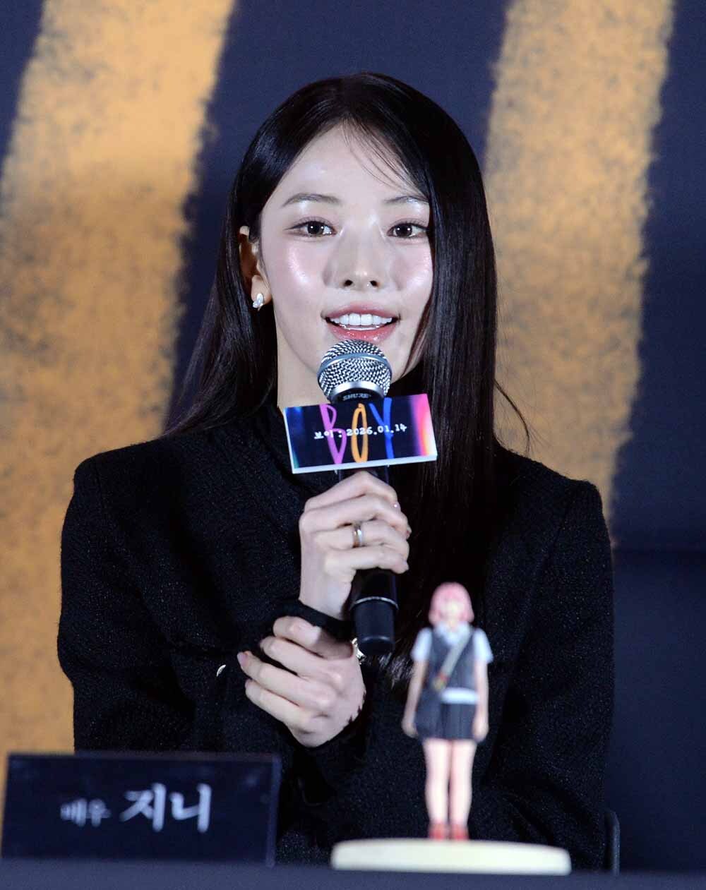 배우 지니가 5일 서울 용산구 CGV 용산점에서 열린 영화 '보이(감독 이상덕)'기자간담회에서 질문에 답하고 있다.