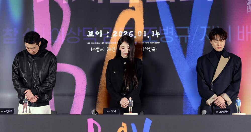 이상덕 감독, 배우 지니, 조병규(왼쪽부터)가 5일 서울 용산구 CGV 용산점에서 열린 영화 '보이(감독 이상덕)'기자간담회에 앞서 고 안성기 배우를 추모하는 묵념을 하고 있다.