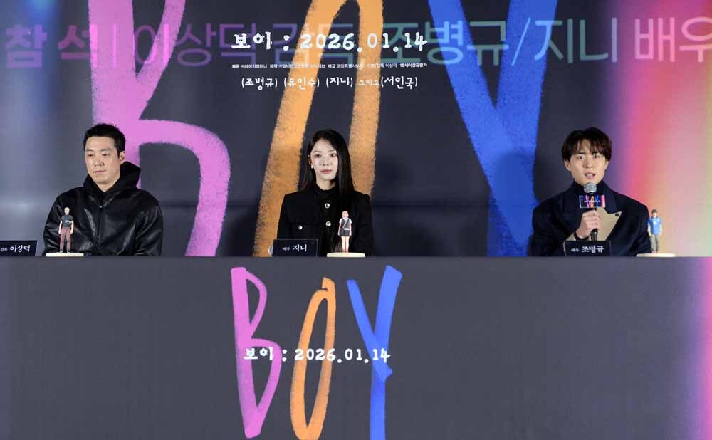 이상덕 감독, 배우 지니, 조병규(왼쪽부터)가 5일 서울 용산구 CGV 용산점에서 열린 영화 '보이(감독 이상덕)'기자간담회에서 질문에 답하고 있다.