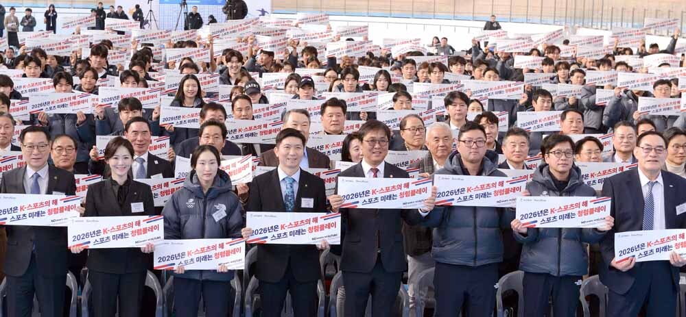 7일 진천국가대표선수촌 벨로드롬 인필드에서 열린 2026 국가대표 훈련개시식에서 유승민 대한체육회장(왼쪽에서 여섯번째), 최휘영 문화체육관광부 장관(왼쪽에서 일곱번째)을 비롯한 내외귀빈 및 선수들이 플랜카드를 들고 파이팅을 외치고 있다. 사진=김두홍 기자 kimdh@sportsworldi.com