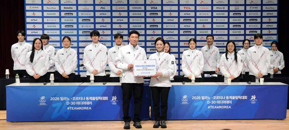 이수경 선수단장(앞줄 오른쪽)이 7일 진천국가대표선수촌 챔피언 하우스에서 열린 2026 밀라노코르티나 동계올림픽대회 D-30 미디어데이 행사에서 유승민 대한체육회 회장에게 격려금을 전달한 뒤 기념촬영을 하고 있다. 사진=김두홍 기자 kimdh@sportsworldi.com