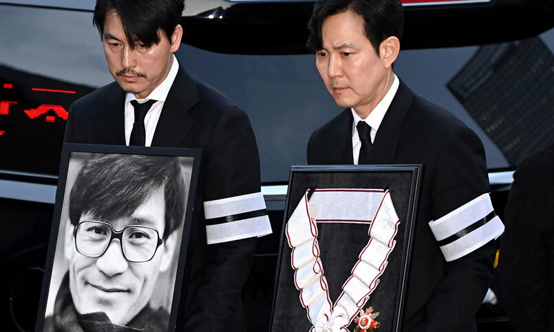 고인과 같은 소속사 아티스트컴퍼니 배우인 정우성이 고인의 영정을, 이정재가 금관문화훈장을 들고 명동성당에 도착했다. 설경구, 박철민, 유지태, 박해일, 조우진, 주지훈 등이 운구를 맡았다.임권택 감독, 현빈, 변요한, 정준호 등도 비통한 표정으로 고인의 마지막 길을 배웅했다.