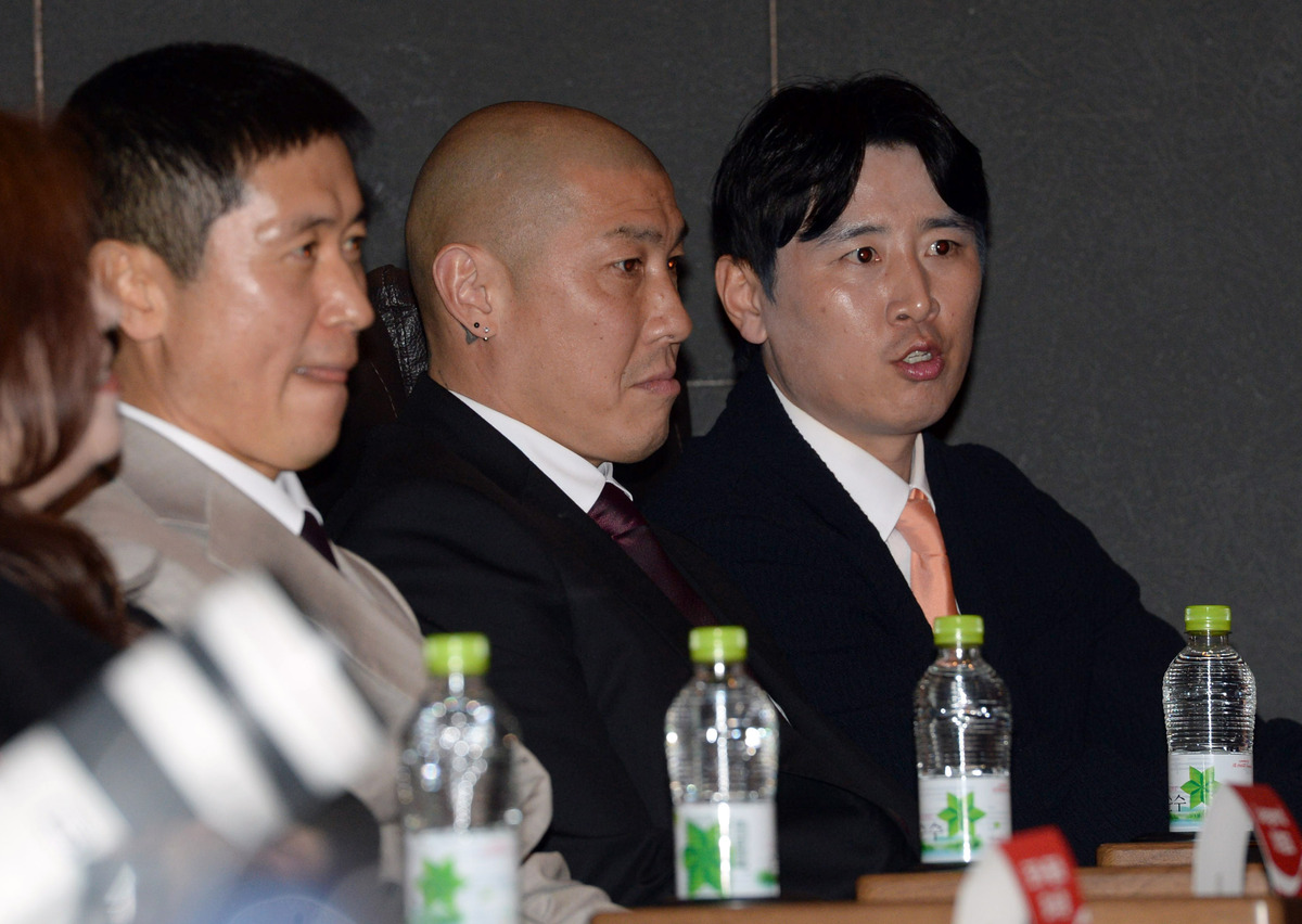 이영표 KBS 축구해설위원, 차두리 화성FC감독, 구자철 레드앤풋볼 아시아 스포츠 디렉터(왼쪽부터)가 16일 서울 용산구 CGV용산아이파크몰에서 열린 FIFA 월드컵 트로피 투어 미디어 간담회에 참석하고 있다.