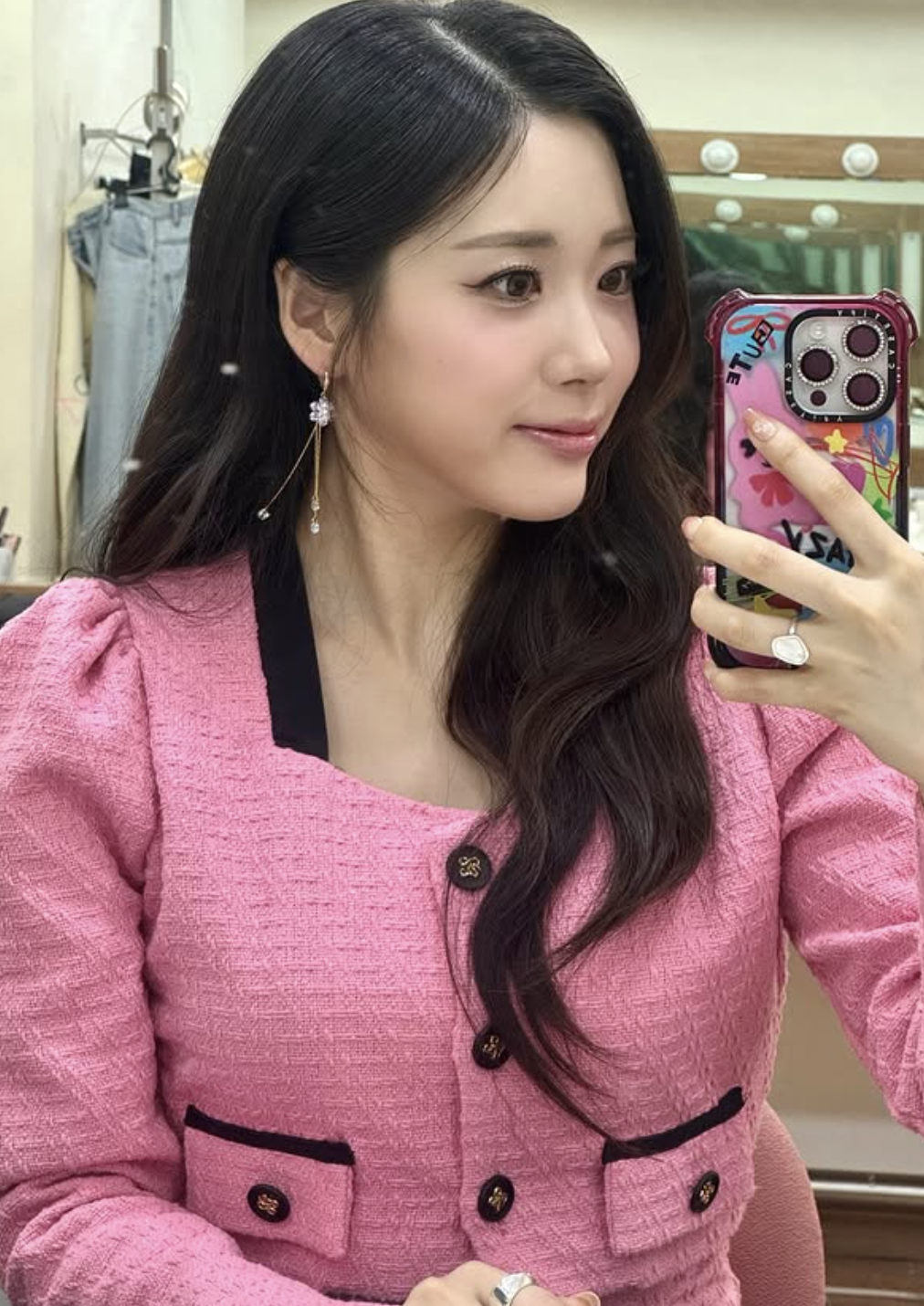 공개된 사진 속 윤서령은 거울을 보며 셀카를 남기고 있다. 은은한 핑크 블러셔와 또렷한 아이라인으로 단정하면서 화사한 메이크업을 완성했으며, 한쪽으로 넘긴 긴 웨이브 헤어와 롱 드롭 이어링으로 여성스러운 분위기를 더했다. 또한 핑크 트위드 재킷으로 클래식하면서도 단정한 스타일을 연출해 시선을 끌었다.