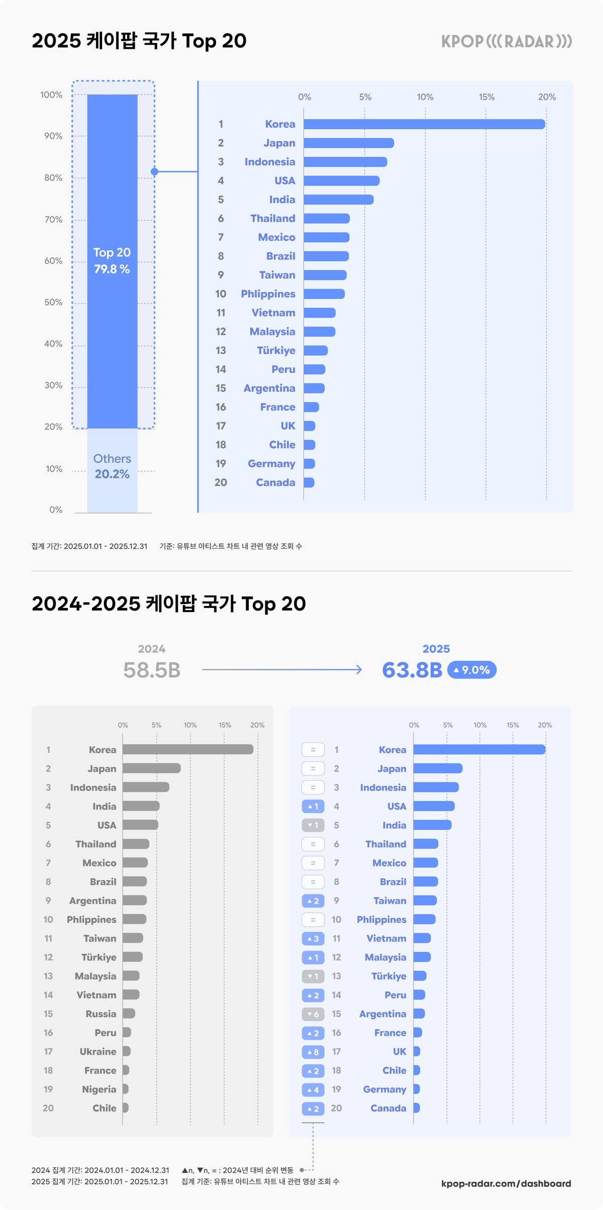 K-팝 아티스트 종합 대시보드 케이팝레이더는 2025 케이팝 세계지도 국가 편을 22일 공개했다. 지난해 1월1일부터 12월31일까지 유튜브 아티스트 차트 내 관련 영상 조회 수를 집계해 한 해 동안의 글로벌 K-팝 흐름을 분석한 결과다. 국가 편에서는 국가별 K-팝 소비 규모 및 아티스트 점유율, 성장률 변화를 통해 각 국가에서 가장 인기 있는 아티스트를 보여준다.