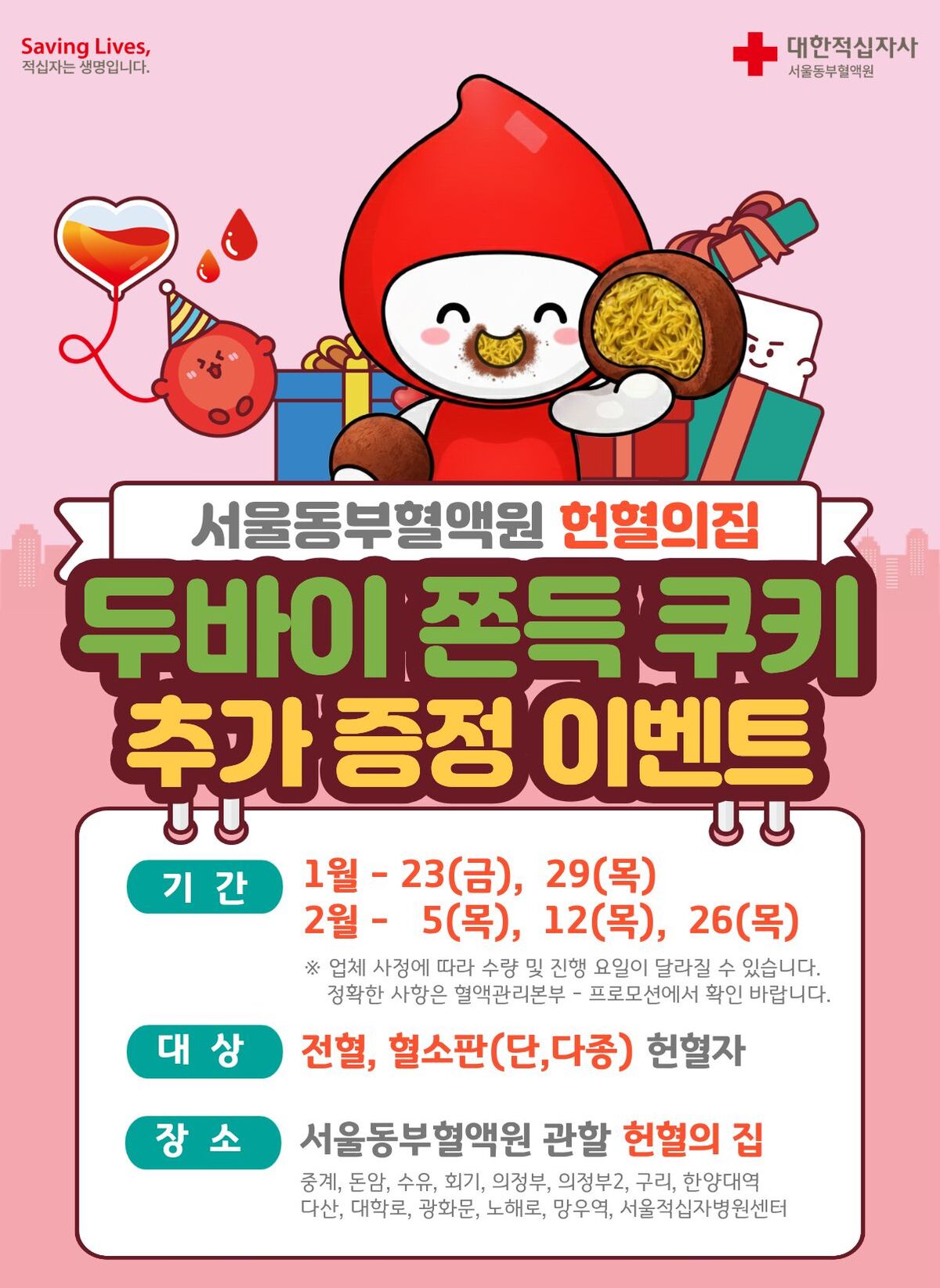 서울동부혈액원은 최근 일부 헌혈의 집에서 긍정적인 반응을 얻은 ‘두바이 쫀득 쿠키(두쫀쿠)’ 이벤트와 연동해 1월 23일(금), 1월 29일(목), 2월 5일(목), 2월 12일(목), 2월 26일(목) 등 총 5회에 걸쳐 매주 1회씩 서울동부혈액원 관할 헌혈의 집에서 진행될 예정이다. 전혈 및 혈소판(단종·다종) 헌혈에 참여한 헌혈자에게는 당일 제작한 두쫀쿠를 선착순으로 증정한다.