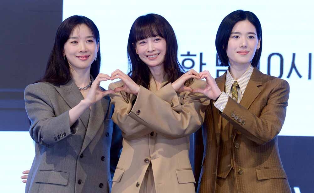 배우 이청아, 이나영, 정은채(왼쪽부터)가 26일 서울 구로구 디큐브시티에서 열린 ENA 월화드라마 '아너 : 그녀들의 법정(감독 박건호)' 제작발표회에서 포즈를 취하고 있다.