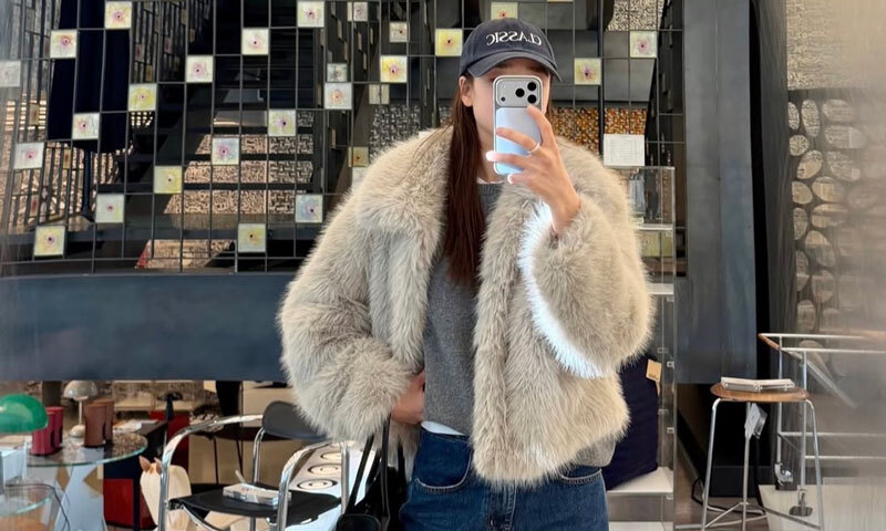 그는 털 재킷을 입고 있다.