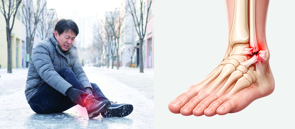 특히 겨울에는 혈관이 수축하면서 근육과 인대가 뻣뻣해지고 반응 속도도 느려지기 때문에, 미끄러지는 순간 균형을 잡지 못하고 발목을 접질리는 경우가 많다. 단순히 ‘삐끗했다’고 생각하고 넘기기 쉬운 상황이지만, 실제로는 발목 인대가 늘어나거나 찢어지는 손상이 발생하는 경우가 적지 않다.