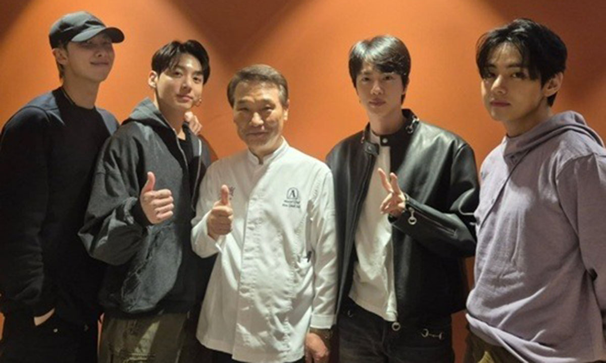 공개된 사진 속에는 RM, 정국, 진, 뷔가 편안한 캐주얼 차림으로 후덕죽 셰프와 함께 다정하게 포즈를 취하고 있는 모습이 담겼다. 정국은 엄지를 치켜세우며 셰프와 함께 포즈를 취했고, 진은 브이 포즈와 환한 미소로 분위기를 더했다. 월드 스타와 중식 대가의 이색적인 만남에 전 세계 팬들의 이목이 집중됐다.