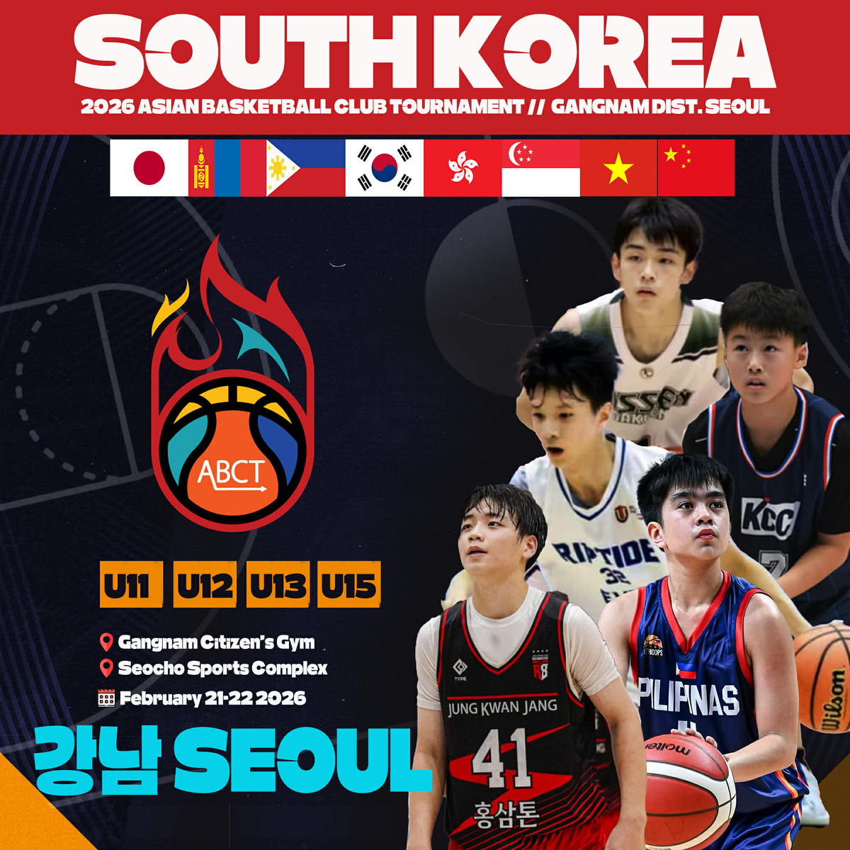 국제 유소년 농구대회 ‘아시아 바스켓볼 챔피언십 토너먼트(ABCT)’가 오는 21일부터 22일까지 서울 강남 일대에서 펼쳐진다. 이번 대회는 한국과 중국, 일본, 필리핀, 몽골, 베트남, 홍콩, 싱가포르 등 아시아 8개국이 참가한다. 각국의 유망주들이 한자리에 모여 우승을 두고 다툰다.