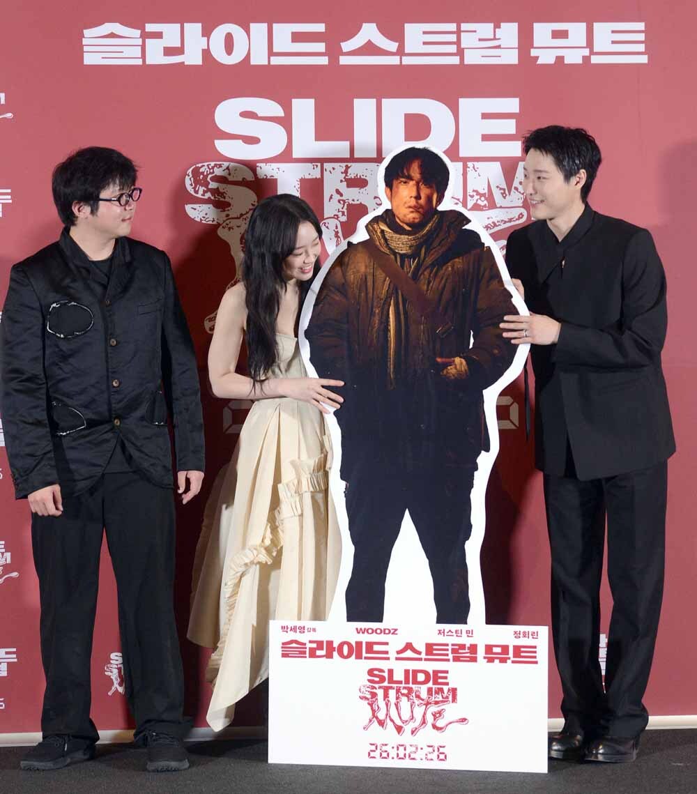 배우 정회린, 감독 박세영, 배우 저스틴 민, 우즈(왼쪽부터)가 20일 서울 용산구 CGV 용산점에서 열린 영화 '슬라이드 스트럼 뮤트(감독 박세영)'기자간담회에서 포즈를 취하고 있다. 영화 '슬라이드 스트럼 뮤트(감독 박세영)'은 오디션에 불합격한 어느 밤, 의문의 남자가 맡긴 부서진 기타를 연주한 ‘우진’이 저주받은 시간을 가로질러 욕망으로 질주하는 이야기를 그린 미스터리 쇼트 필름으로 우즈, 저스틴 민, 정회린 등이 출연한다. 사진=김두홍 기자 kimdh@sportsworldi.com