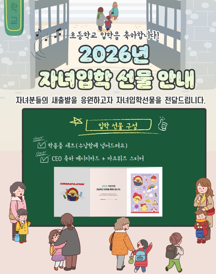 업체에 따르면 네오위즈는 새학기를 맞아 올해 초등학교에 입학하는 자녀를 둔 임직원을 대상으로는 실용성을 고려한 맞춤 선물을 전달한다. 수납함을 비롯해 각종 필기구 외에도 물감 세트, 리코더, 줄넘기, 크레파스 등 학교 생활에 필요한 다양한 학용품으로 구성했다. 대표이사의 축하 메시지가 담긴 카드와 네오위즈의 캐릭터 ‘마요위즈’ 스티커도 함께 제공한다.