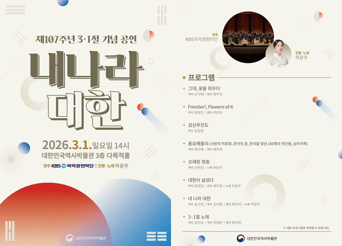 한수 대한민국역사박물관장은 “3·1절에 박물관 특별전시를 관람하고 KBS국악관현악단의 3·1절 기념 공연을 즐기며 독립을 향한 희망과 노력을 돌아보고 우리가 나아가야 할 미래를 생각하는 계기가 되길 바란다”고 말했다.